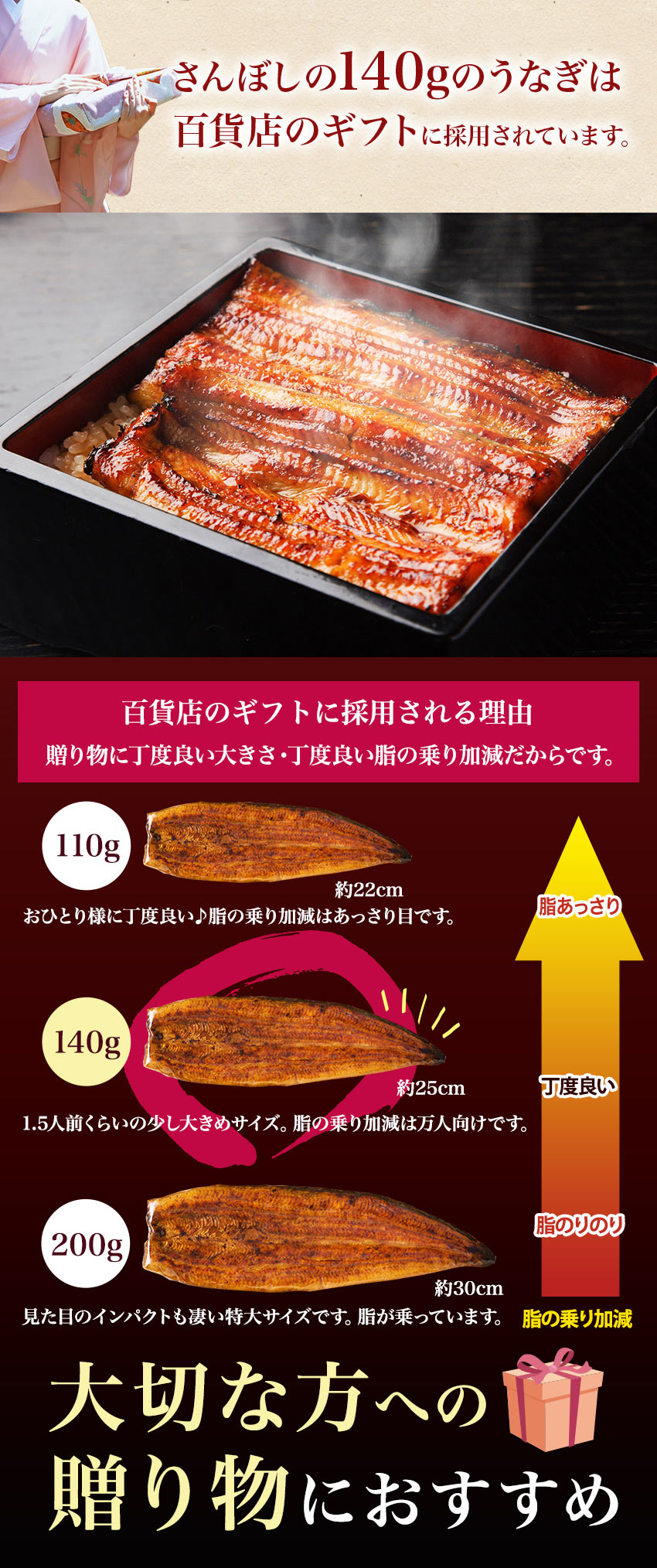 | 内容量 | うなぎ蒲焼140g×2袋 うなぎ蒲焼きのたれ100ml×1本 こだわりの山椒(0.2g×5袋)×1 |