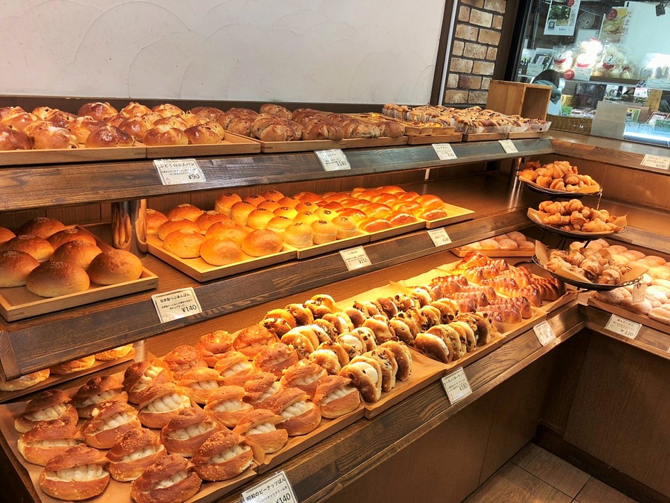 自家製カレーパン、石窯焼き食パン、イカスミ明太フィセル、野沢菜おやき、さくさくメロンパン、クルミパンなど、全80種以上。